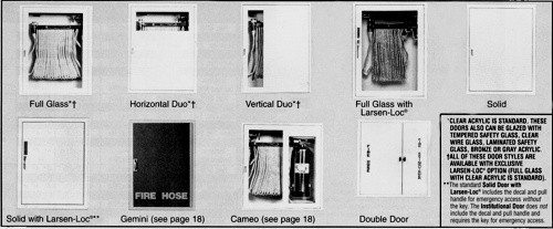 | *Clear acrylic is standard. These doors can also be glazed with tempered safety glass, clear wire glass, laminated safety glass, bronze or gray acrylic. † All of these door styles are available with exclusive Larsen-Loc option (Full Glass With Clear Acrylic Is Standard). **The standard Solid Door with Larsen-Locョ includes the decal and pull handle for emergency access without the key. The Institutional Door does not include the decal and pull handle for emergency access. |